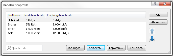 Um der Tabelle Bandbreitenprofile manuell Einträge hinzuzufügen, klicken Sie auf die Schaltfläche Hinzufügen.