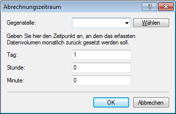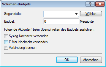 Im Feld Gegenstelle können Sie die Gegenstelle auswählen, für die Sie das Volumen-Budget angeben wollen. Mit Wählen können Sie aus den verfügbaren Gegenstellen auswählen bzw. neue Gegenstellen verwalten.