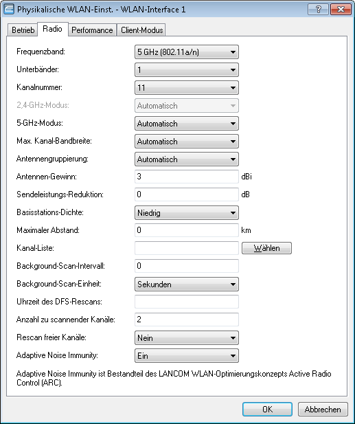 - Dieser Eintrag bestimmt die minimale Anzahl an freien Kanälen, die ein DFS-Scan erreichen muss. Der Standardwert '2' bedeutet, dass das Gerät solange einen DFS-Scan durchführt, bis es 2 freie Kanäle erkennt. Im Falle eines nötigen Kanalwechsels, z. B. auf Grund eines aktivierten Radarmusters, steht der zweite Kanal sofort für einen Wechsel zur Verfügung. Der Wert '0' deaktiviert die Beschränkung. Die physikalische WLAN-Schnittstelle führt einen DFS-Scan auf sämtlichen zur Verfügung stehenden Kanälen aus.