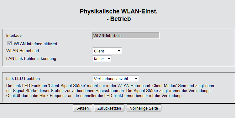 Wählen Sie im Abschnitt "Interfaces" die Wireless-LAN-Einstellung Physikalische WLAN-Einst. - Betrieb und stellen Sie die WLAN-Betriebsart auf Client. Bestätigen Sie Ihre Auswahl mit einem Klick auf die Schaltfläche Setzen.