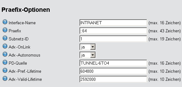 Bestimmen Sie als Präfix den Wert "::/64", um das vom Provider vergebene Präfix automatisch und in voller Länge zu übernehmen.