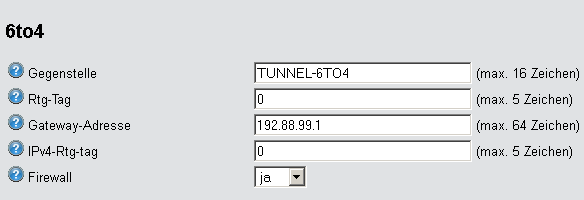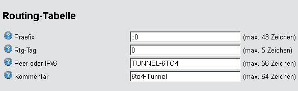 Im Feld Peer-oder-IPv6 tragen Sie den Namen des Interfaces ein, das den 6to4-Tunnel verwenden wird, im Beispiel oben "TUNNEL-6TO4".