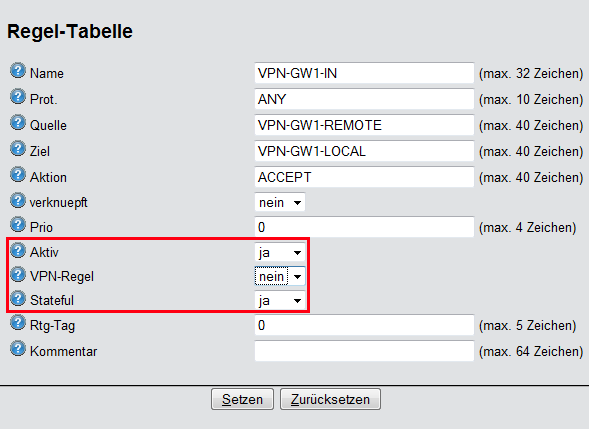 - Für die eingehende Datenübertragung erstellen Sie eine Firewall-Regel unter dem Namen „VPN-GW1-IN“ mit den gleichen Parametern wie die vorherige Regel. Nur bei den Stationen sind hier die Quell- und Zielnetze vertauscht: