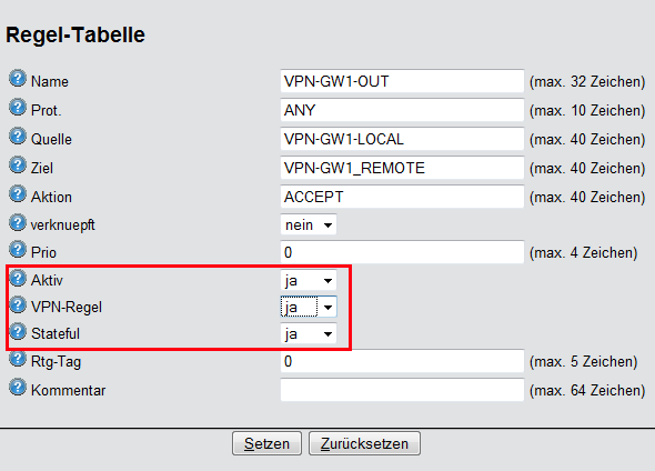 Anmerkung: In der Regel empfiehlt sich die Trennung von Regeln, mit denen die VPN-Netzbeziehungen gebildet werden, und den Firewall-Regeln, die Auswirkungen z. B. auf die bei der Kommunikation zugelassenen Dienste haben.