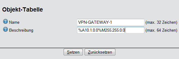 Für die an das eigene LAN angebundenen Teilnetze wird als Router die IP-Adresse des jeweiligen LAN-Routers eingetragen:IP-Adresse Netzmaske Router IP-Masquerading 10.1.0.0 255.255.0.0 VPN-Gateway-1 Nein 10.2.0.0 255.255.0.0 VPN-Gateway-1 Nein 10.3.0.0 255.255.0.0 VPN-Gateway-1 Nein Mit diesen Einträgen ist das VPN-Gateway 2 in der Lage, auch die aus dem entfernten Netz eintreffenden Pakete für die angebundenen Netzabschnitte richtig weiterzuleiten.IP-Adresse Netzmaske Router IP-Masquerading 10.5.0.0 255.255.0.0 10.4.0.5 Nein - Erstellen Sie unter Konfiguration / Firewall/QoS / Objekt-Tabelle jeweils einen Eintrag für die Netzbereiche, die bei der VPN-Verbindung mit „VPN-GATEWAY-1“ als Quelle oder Ziel verwendet werden sollen („VPN-GW1-LOCAL“ und „VPN-GW1-REMOTE“). Geben Sie dabei die Netzbereiche z. B. in der Form „%A10.1.0.0 %M255.255.0.0“ ein.