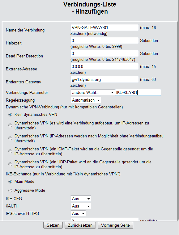- Erstellen Sie unter Konfiguration / VPN / Verbindungsliste einen neuen Eintrag mit dem Namen des entfernten Gateways als „Name“. Als „Entferntes Gateway“ tragen Sie die öffentliche Adresse der Gegenstelle ein: entweder die feste IP-Adresse oder den DNS-auflösbaren Namen.