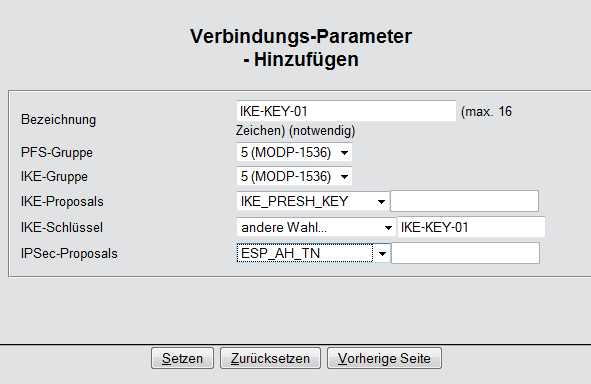 - Erstellen Sie unter Konfiguration / VPN / Allgemein / Verbindungsparameter einen neuen „VPN-Layer“ für die Verbindungsparameter. Wählen Sie dabei den zuvor erstellten IKE-Schlüssel aus.