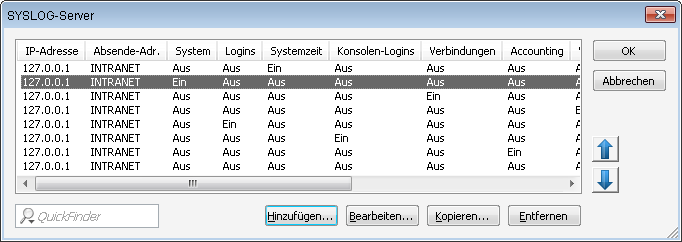Die im SYSLOG ursprünglich definierten acht Prioritätsstufen sind im Gerät auf fünf Stufen reduziert. Die nachfolgende Tabelle zeigt die Zuordnung zwischen Alarmlevel, Bedeutung und SYSLOG-Prioritäten.Quelle Bedeutung Facility System Systemmeldungen (Bootvorgänge, Timersystem etc.) KERNEL Logins Meldungen über Login und Logout eines Users während der PPP-Verhandlung sowie dabei auftretende Fehler AUTH Systemzeit Meldungen über Änderungen der Systemzeit CRON Konsolen-Logins Meldungen über Konsolen-Logins (Telnet, Outband, etc), Logouts und dabei auftretende Fehler AUTHPRIV Verbindungen Meldungen über den Verbindungsauf- und -abbau sowie dabei auftretende Fehler (Display-Trace) LOCAL0 Accounting Accounting-Informationen nach dem Abbau einer Verbindung (User, Onlinezeit, Transfervolumen) LOCAL1 Verwaltung Meldungen über Konfigurationsänderungen, remote ausgeführte Kommandos etc. LOCAL2 Router Regelmäßige Statistiken über die am häufigsten genutzten Dienste (nach Portnummern aufgeschlüsselt) sowie Meldungen über gefilterte Pakete, Routing-Fehler etc. LOCAL3 Priorität Bedeutung SYSLOG-Priorität Alarm Hierunter werden alle Meldungen zusammengefasst, die der erhöhten Aufmerksamkeit des Administrators bedürfen. PANIC, ALERT, CRIT Fehler Auf diesem Level werden alle Fehlermeldungen übermittelt, die auch im Normalbetrieb auftreten können, ohne dass ein Eingriff des Administrators notwendig wird (z. B. Verbindungsfehler). ERROR Warning Dieser Level übermittelt Fehlermeldungen, die den ordnungsgemäßen Betrieb des Geräts nicht beeinträchtigen. WARNING Information Auf diesem Level werden alle Nachrichten übermittelt, die rein informellen Charakter haben (z. B. Accounting-Informationen). NOTICE, INFORM Debug Übertragung aller Debug-Meldungen. Debug-Meldungen erzeugen ein erhebliches Datenvolumen und beeinträchtigen den ordnungsgemäßen Betrieb des Geräts. Sie sollten daher im Regelbetrieb ausgeschaltet sein und nur zur Fehlersuche verwendet werden. DEBUG - Wenn Sie alle Parameter definiert haben, bestätigen Sie die Eingaben mit OK. In der SYSLOG-Tabelle wird der SYSLOG-Client mit seinen Parametern eingetragen.