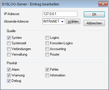 - Wählen Sie aus, welche der geräteinternen Quellen Nachrichten an diesen SYSLOG-Client versenden sollen.