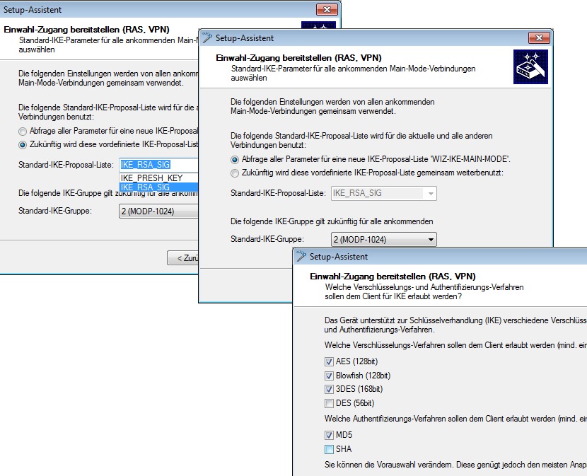 - Wählen Sie den Assistenten zum Bereitstellen von Zugängen über VPN. Wählen Sie dann im entsprechenden Dialog die VPN-Verbindungsauthentifizierung über Zertifikate (RSA-Signature). Als „Exchange Mode“ wird dabei automatisch der Main Mode verwendet.