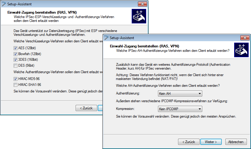 - Für die Übertragung der Nutzdaten mit IPSec können in den folgenden Dialogen die Verschlüsselungs- und Authentifizierungsverfahren sowie die „Authentication Header“ und die Datenkompression festgelegt werden, die der Client verwenden kann. Verwenden Sie nach Möglichkeit die voreingestellten Werte, sofern der Client keine anderen Einstellungen erwartet.