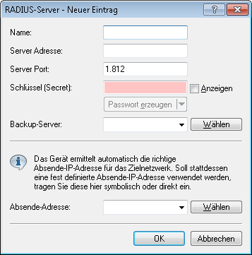 - Geben Sie hier die IP-Adresse (IPv4, IPv6) oder den Host-Namen des RADIUS-Servers an, mit dem Sie zentral die Benutzer verwalten.