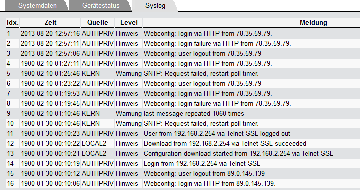 Das Gerät legt Syslog-Informationen im Arbeitsspeicher ab (siehe dazu Das SYSLOG-Modul). Die letzten Ereignisse können Sie zur Diagnose über WEBconfig auf der Registerkarte Gerätestatus einsehen.