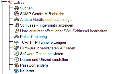 Im Menübereich Extras finden Sie einige Funktionen, welche die Konfiguration der Geräte erleichtern; je nach Gerät aber auch einige Sonderfunktionen und spezielle Analysemodule bereitstellen, die sich keinem der bisherigen Menüpunkte sinnvoll zuordnen lassen.
