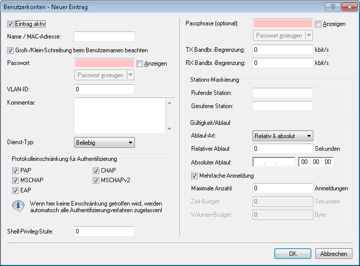 - Eintrag aktiv: Über diese Option aktivieren bzw. deaktivieren Sie gezielt ein RADIUS-Benutzerkonto. Auf diese Weise lassen sich z. B. einzelne Benutzerkonten temporär abschalten, ohne dafür das komplette Konto zu löschen.