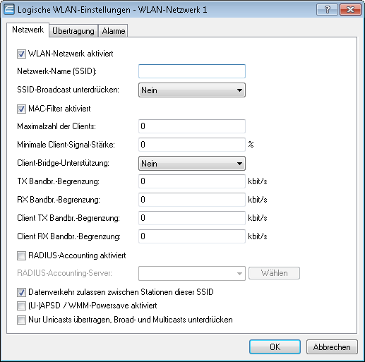 2. Aktivieren Sie auf der Registerkarte Netzwerk das WLAN-Netzwerk und tragen Sie die SSID des Netzwerks ein, bei dem sich die Clientstation einbuchen soll.
