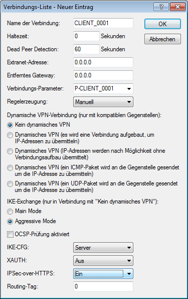 Anmerkung: Bitte beachten Sie, dass bei eingeschalteter IPSec over HTTPS-Option die VPN-Verbindung nur aufgebaut werden kann, wenn die Gegenstelle diese Technologie ebenfalls unterstützt und die Annahme von passiven VPN-Verbindungen mit IPSec over HTTPS bei der Gegenstelle aktiviert ist.