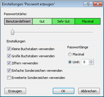Stellen Sie mit dem Schieberegler die gewünschte Passwortstärke ein. In der Einstellung Benutzerdefiniert haben Sie die Möglichkeit, die maximale Passwortlänge und die erforderlichen Zeichentypen zu definieren. In den Einstellungen Gut, Sehr Gut und Maximal sind die Einstellungen mit sinnvollen, nicht veränderbaren Werten vorbelegt.