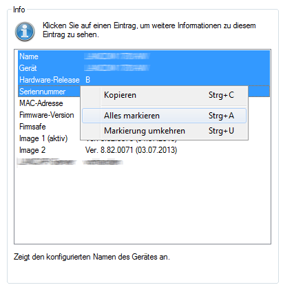 Anmerkung: Durch einen Klick mit der rechten Maustaste auf die linke Spalte mit den Namen der Einträge, erhalten Sie ein Kontextmenü. Über dieses können Sie die Werte auch in die Zwischenablage übernehmen.