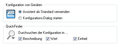 Sie können auswählen, ob Sie für die Konfiguration den Setup-Assistenten als Standard verwenden oder ob Sie standardmäßig den Konfigurations-Dialog zur manuellen Bearbeitung starten wollen, wenn Sie einen Doppeklick auf ein Gerät ausführen. In der Standard-Einstellung wird durch Doppelklick auf ein Gerät die Übersicht der Setup-Assistenten geöffnet.