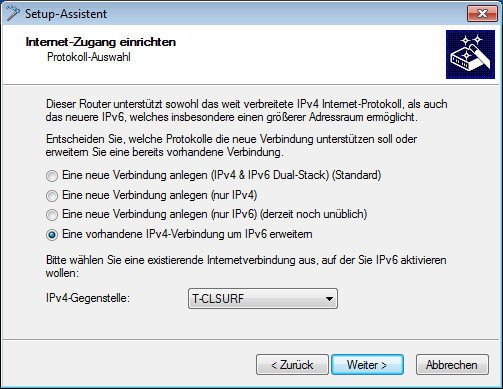 Wenn Sie ein Gerät für IPv4 konfiguriert haben und zusätzliche eine IPv6-Verbindung einrichten wollen, haben Sie die Möglichkeit, diese IPv6-Verbindungen über den Setup-Assistenten herzustellen.