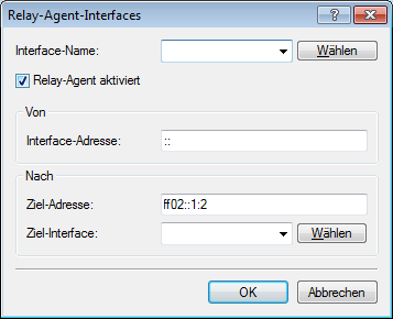 - Das Ziel-Interface, über das der übergeordnete DHCPv6-Server oder der nächste Relay-Agent zu erreichen ist. Die Angabe ist zwingend erforderlich, wenn unter der Ziel-Adresse eine Linklokale Multicast-Adresse konfiguriert wird, da Linklokale Multicast-Adressen immer nur auf dem jeweiligen Link gültig sind.