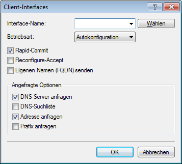 - Name des Interfaces, auf dem der DHCPv6-Client arbeitet Dies können LAN-Interfaces oder WAN-Interfaces (Gegenstellen) sein, z. B. "INTRANET" oder "INTERNET".