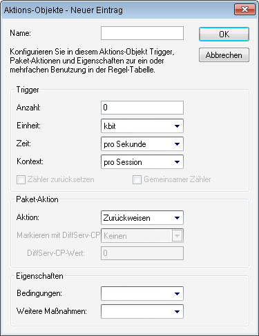 - Bestimmt, welche Trigger-Aktionen die Firewall zusätzlich zur Filterung der Datenpakete starten soll. Die Trigger-Aktionen können Sie unter Weitere Maßnahmen definieren.