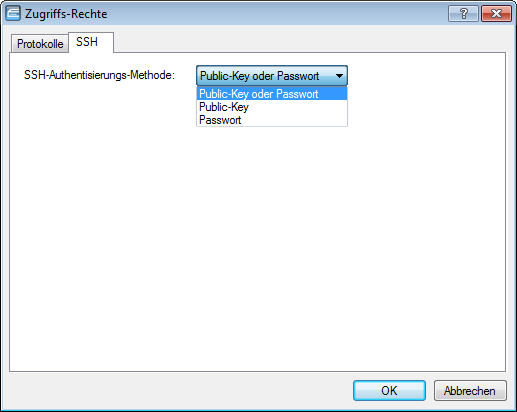Die zulässigen Authentifizierungs-Methoden für den SSH-Zugang können