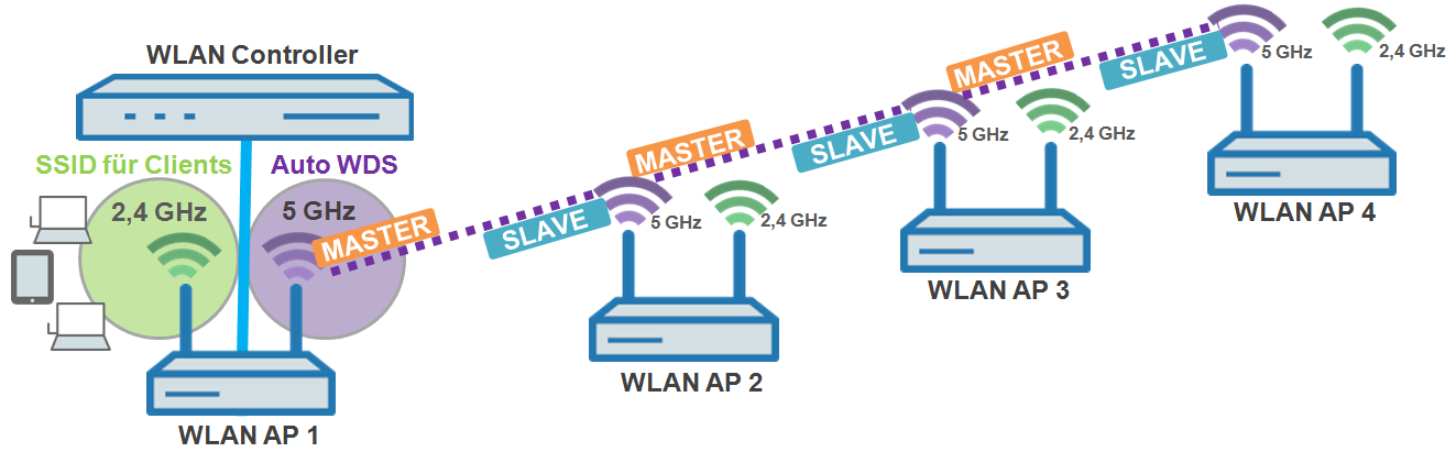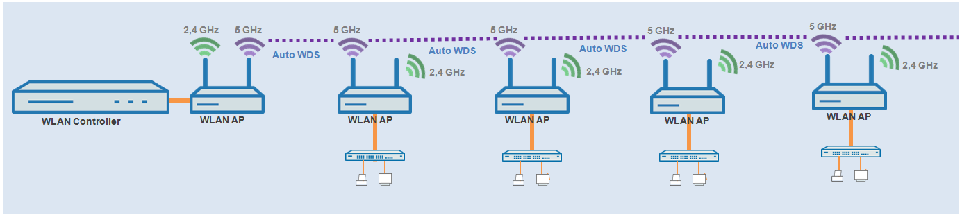 - Generell ist ein AutoWDS-Betrieb von bis zu maximal 3 Hops empfehlenswert.
