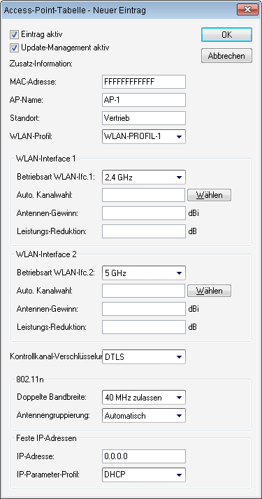 Erstellen Sie einen Satz von physikalischen Parametern für die verwendeten APs. Dabei wird die Management-VLAN-ID auf '1' gesetzt, um die VLAN-Nutzung generell zu aktivieren (jedoch ohne separates Management-VLAN für das Gerät, der Management-Datenverkehr wird untagged übertragen).