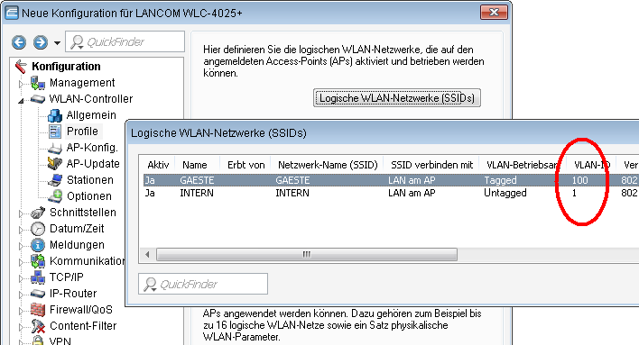 - Das WLAN mit der SSID 'GAESTE' nutzt die VLAN-ID '100', hier wird keine Verschlüsselung verwendet.
