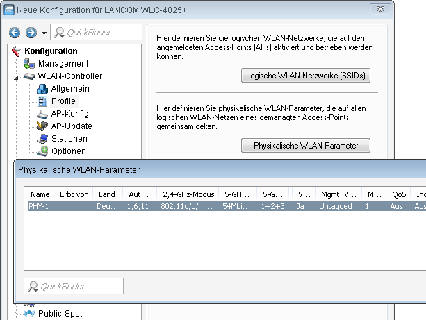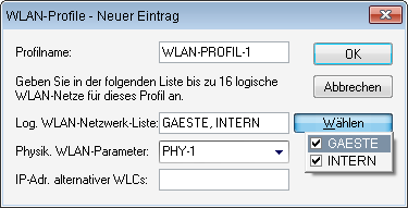 Erstellen Sie ein WLAN-Profil, das den APs zugewiesen werden kann. In diesem WLAN-Profil werden die beiden zuvor erstellten logischen WLAN-Netzwerke und der zuvor erstellte Satz von physikalischen Parametern zusammengefasst.