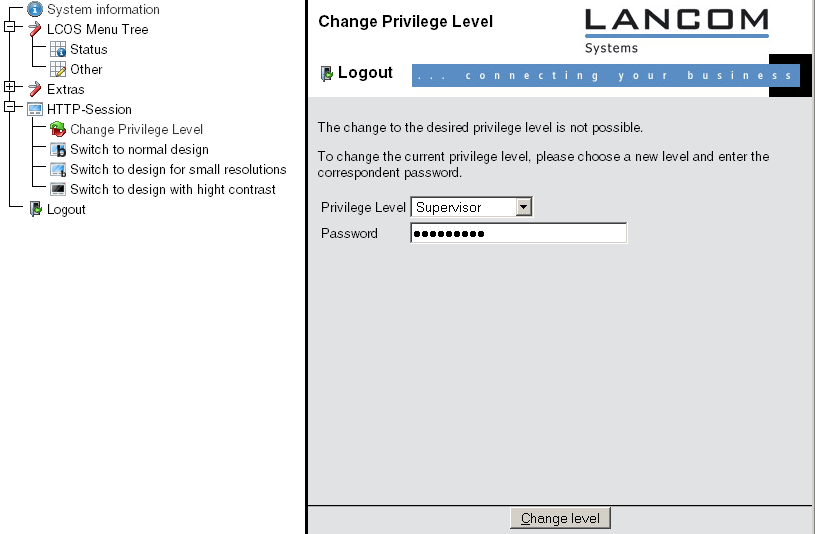 To gain further rights, click on the link Change privilege level on the left of the screen.