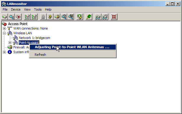 In LANmonitor the connection quality display is opened with the context menu. Right-clicking with the mouse on 'Point-to-point' activates the option 'Adjusting Point-to-Point WLAN Antennas...'