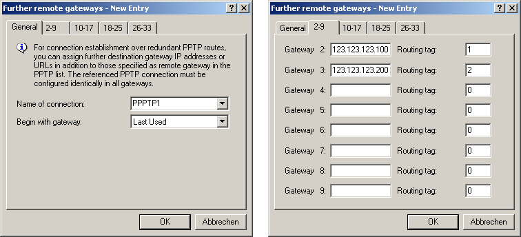 Note: If you do not specify a routing tag here (i.e. routing tag is 0), then the routing tag configured for this remote station in the PPTP connection list will be taken for the associated gateway.