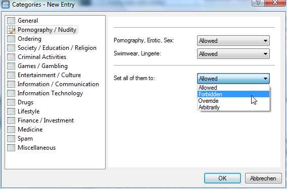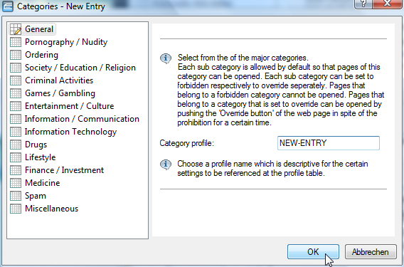 Here you create a category profile and determine which categories or groups should be used to rate websites for each category profile. You can allow or forbid the individual categories or activate the override function for each group.