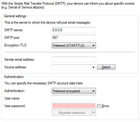 Authentication: Here you determine if and how the device authenticates at the SMTP server. The available values have the following meaning: