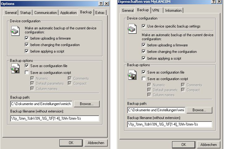 LANconfig can automatically save backups of the current configuration prior to changes in firmware or configuration. Global settings to be used for all devices are available under Tools / Options / Backup. Additionally, special backup settings can be defined for individual devices. To access them, right-click the appropriate device and select entry Properties / Backup from the context menu.