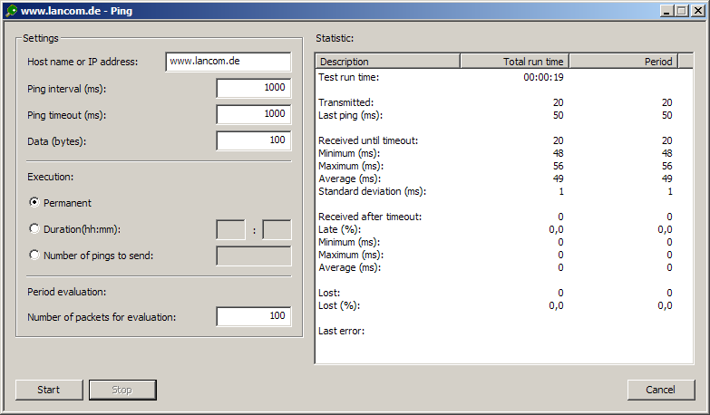LANmonitor can be used to check the connection quality between stations in the LAN, WAN or WLAN. LANmonitor sends pings from the computer on which it is installed to the remote site at regular intervals. The responses it receives are the basis for a compiled report.