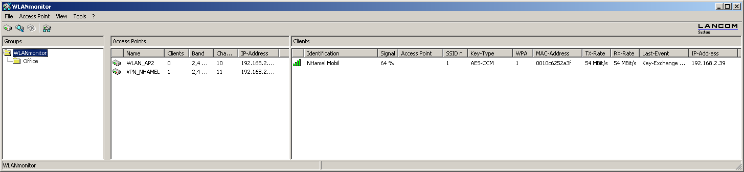 After starting WLANmonitor, commence a search for available access points via the menu item File / Find access points. The access points found are listed in the middle column. Also shown here is the main information for each access point such as the name, number of registered clients, the frequency band and channels being used.
