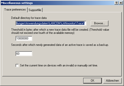 When starting a trace with LANmonitor, a backup file with the current trace data is automatically saved. The settings for the trace backup can be configured with Extras / Other settings / Trace backup. Enter the following parameters: