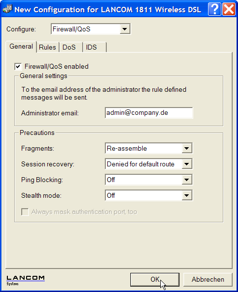 If the email system of the LANCOM is activated, then you can use the comfortable notification by email. The device sends an email to the administrator as soon as the firewall executes the appropriate action:
