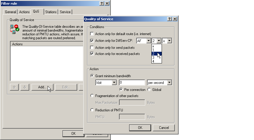 These examples reserve a desired bandwidth for Voice over IP phone calls. The first element “%Lcds0 @dAFxx %A“ accepts DSCP “AFxx” marked packets of signalling calls. Voice data marked with “EF” is transferred preferentially by the entry “%Qcds32 @dEF“, and a bandwidth of 32 Kbps is guaranteed thereby as well. In parallel, the PMTU is reduced to 256 byte by “%Fprw256 @dEF“, which enables ensuring the required bandwidth in receiving direction at all.