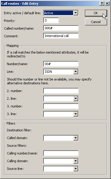 This suggested call routing table would place all external calls over the ISDN line. The SIP line is set up as a backup for international and national long distance calls and local calls that are not in the list of special or emergency numbers.