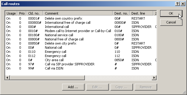 Note: This call routing table is only valid for PBX systems in which the subscribers have to dial '0' to access an outside line. If the PBX uses another mechanism for accessing an outside line, then the table must be adapted accordingly.