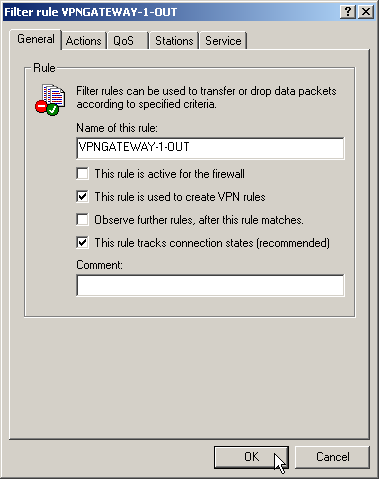 IP address Net mask Router IP masquerading 10.4.00.0 255.255.0.0 VPN gateway 2 No 10.5.0.0 255.255.0.0 VPN gateway 2 No These entries enable VPN gateway 1 to forward packets arriving from the remote network to the correct sections of the local network.IP address Net mask Router IP masquerading 10.2.0.0 255.255.0.0 10.1.0.2 No 10.3.0.0 255.255.0.0 10.1.0.3 No - Change to the “Firewall/QoS” configuration area. On the “Rules” tab, add a new firewall rule with the name “VPN GATEWAY 1 OUT” and activate the option “This rule is used to create VPN rules”. This ensures that IP networks described in this rule will be used in establishing VPN network relationships.