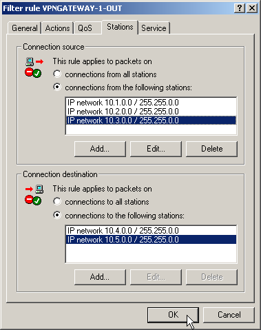 - On the “Stations” tab for these firewall rules, define the source of the data transfers as the subnets at the local site, and set the destination as all of the subnets at the remote site.