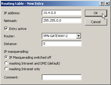 - Change to the “IP Router” configuration area. On the “Routing” tab, make a new entry in the routing table for those parts of networks that are to be accessible in the remote and in the local LAN. In each case, define the router as the remote VPN gateway and switch the IP masquerading off.