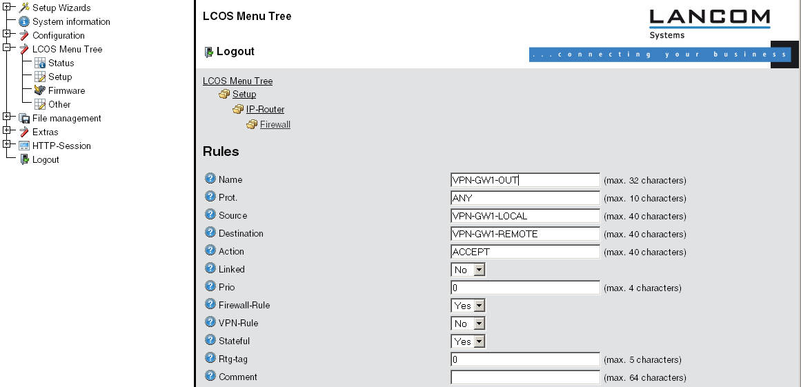 - Under Configuration / Firewall/QoS / Rules table define a new firewall rule named “VPN-GW1-OUT”. Set the objects to “CPN-GW1-LOCAL” and “VPN-GW1-REMOTE”, the protocol to “ANY” and the action to “ACCEPT”. Activate the option “VPN rule” so that the IP networks described in this rule will be used in establishing VPN network relationships.